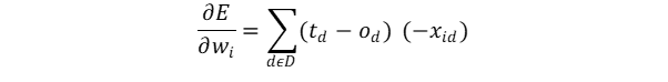 We have arrived at our final euqation on how to update our weights using delta rule. One more key difference is that, in perceptron rule we modify the weights after training all the samples, but in delta rule we update after every misclassification, making the chance of reaching global minima high.